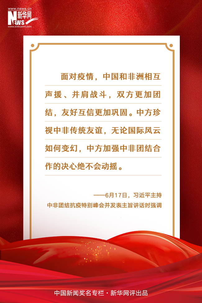 新老朋友通過視頻相聚,共商團(tuán)結(jié)抗疫大計,共敘中非兄弟情誼。6月17日,由中國和非洲聯(lián)盟輪值主席國南非、中非合作論壇共同主席國塞內(nèi)加爾共同發(fā)起的中非團(tuán)結(jié)抗疫特別峰會舉行。國家主席習(xí)近平在北京主持了這一峰會,并發(fā)表題為《團(tuán)結(jié)抗疫 共克時艱》的主旨講話,強(qiáng)調(diào)中非要堅定不移攜手抗擊疫情、推進(jìn)中非合作、踐行多邊主義、推進(jìn)中非友好,共同打造中非衛(wèi)生健康共同體,推進(jìn)中非全面戰(zhàn)略合作伙伴關(guān)系高水平發(fā)展。