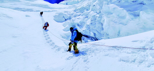 5月9日,陳剛等人從6500米營地前往7028米營地,攀登大冰壁途中。中國地質(zhì)大學(武漢)供圖
