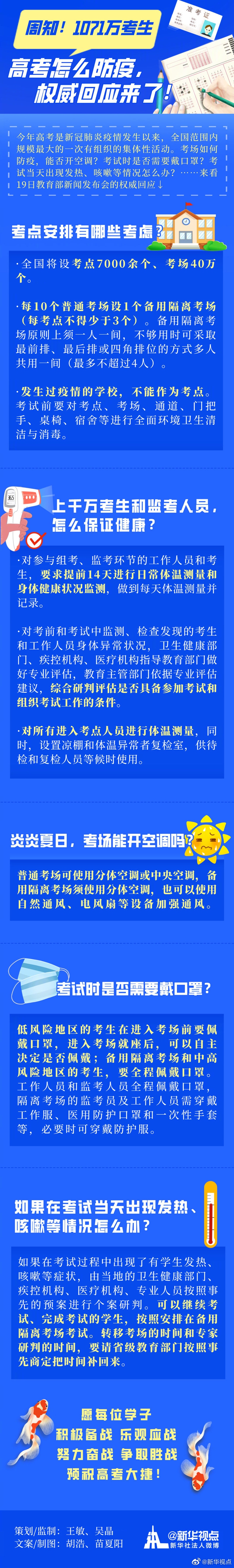 半個(gè)多月以后的7月7日和8日,1071萬(wàn)考生將迎來(lái)人生當(dāng)中的一次大考。今年高考是新冠肺炎疫情發(fā)生以來(lái),全國(guó)范圍內(nèi)規(guī)模最大的一次有組織的集體性活動(dòng)。考場(chǎng)如何防疫,能否開(kāi)空調(diào)?考試時(shí)是否需要戴口罩?考試當(dāng)天出現(xiàn)發(fā)熱、咳嗽等情況怎么辦?……來(lái)看19日教育部新聞發(fā)布會(huì)的權(quán)威回應(yīng)↓