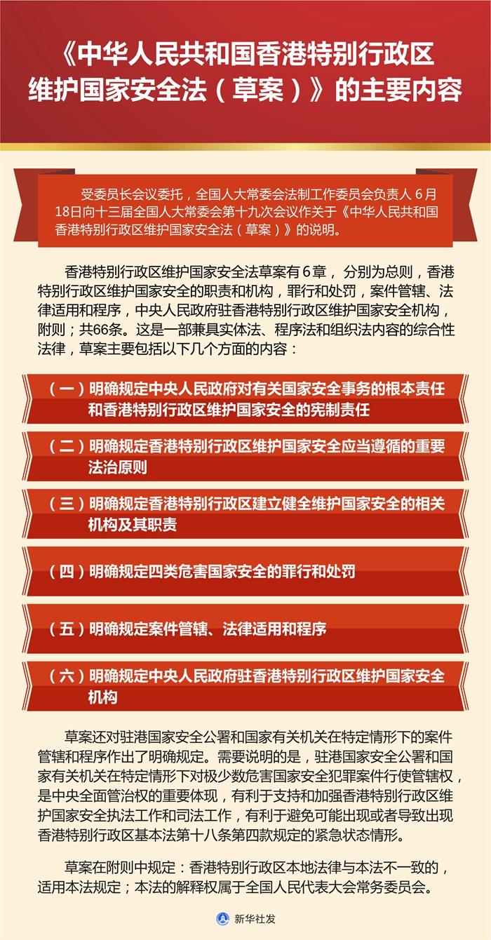 香港特別行政區(qū)維護(hù)國家安全法草案有6章,分別為總則,香港特別行政區(qū)維護(hù)國家安全的職責(zé)和機(jī)構(gòu),罪行和處罰,案件管轄、法律適用和程序,中央人民政府駐香港特別行政區(qū)維護(hù)國家安全機(jī)構(gòu),附則;共66條。這是一部兼具實體法、程序法和組織法內(nèi)容的綜合性法律,草案主要包括以下幾個方面的內(nèi)容: