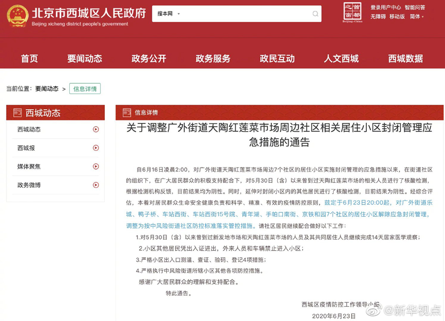 北京市西城區(qū)23日發(fā)布通告:6月23日20:00起,對(duì)廣外街道樂城、鴨子橋、車站西街、車站西街15號(hào)院、青年湖、手帕口南街、京鐵和園7個(gè)社區(qū)的居住小區(qū)解除應(yīng)急封閉管理,調(diào)整為按中風(fēng)險(xiǎn)街道社區(qū)防控標(biāo)準(zhǔn)落實(shí)管控措施。6月15日,北京市西城區(qū)衛(wèi)生健康委員會(huì)官方微博通報(bào)稱,6月14日,廣外天陶紅蓮菜市場有一名往來新發(fā)地市場人員被確診為新冠肺炎病例。(記者烏夢達(dá)、魯暢)