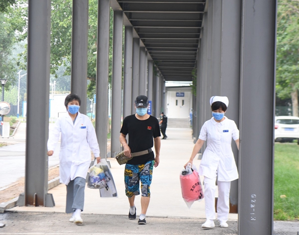 今天出院的老何戴著棒球帽,穿著黑色的短袖衫,綠底兒的沙灘褲,一身輕松。站在地壇醫(yī)院南門廣場,老何的口罩戴得嚴(yán)嚴(yán)實(shí)實(shí),他說自己在新發(fā)地市場買點(diǎn)牛羊肉,口罩沒戴嚴(yán)實(shí),“提醒咱們市民一定要做好防控,戴好口罩?!?/p>