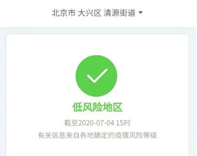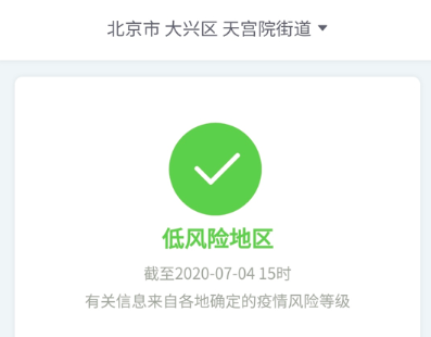 北京日報記者從國務院客戶端小程序“疫情風險等級”了解到,截至7月4日15時,北京市大興區(qū)天宮院街道、清源街道由中風險地區(qū)調整為低風險地區(qū);北京市大興區(qū)黃村(地區(qū))鎮(zhèn)由高風險降級為中風險。