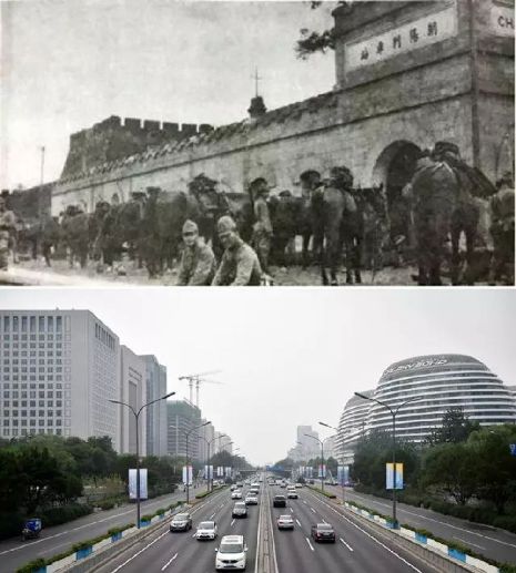 上圖為1937年8月8日,日本騎兵在朝陽門車站集結(資料照片);下圖為2017年7月3日拍攝的朝陽門地區(qū)(新華社記者 張晨霖 攝)。