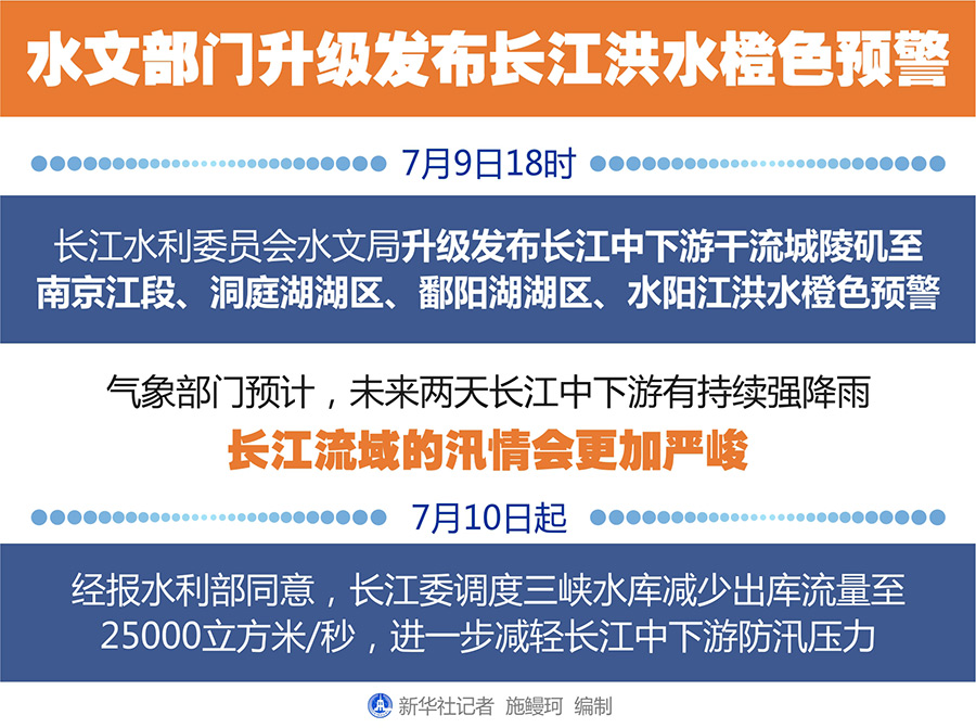 新華社武漢7月9日電(記者李思遠、樂文婉)長江水利委員會水文局9日18時升級發(fā)布長江中下游干流城陵磯至南京江段、洞庭湖湖區(qū)、鄱陽湖湖區(qū)、水陽江洪水橙色預警。水文部門提醒,有關單位和公眾務必注意防范日益嚴峻的汛情。