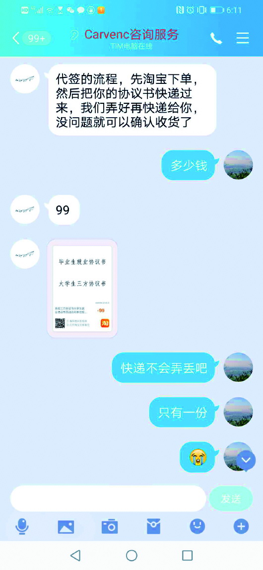 淘寶網(wǎng)上有多家能代簽三方協(xié)議的商家。在看到記者“能否代蓋三方協(xié)議公章”的留言后,一家名為“carvenc education”的商家立即追問所在學(xué)校、專業(yè)。記者提供相關(guān)信息后,不到一分鐘,商家就發(fā)來相匹配的公司名稱和崗位,“只要99元,協(xié)議書真實(shí)有效,包回訪?!?/p>