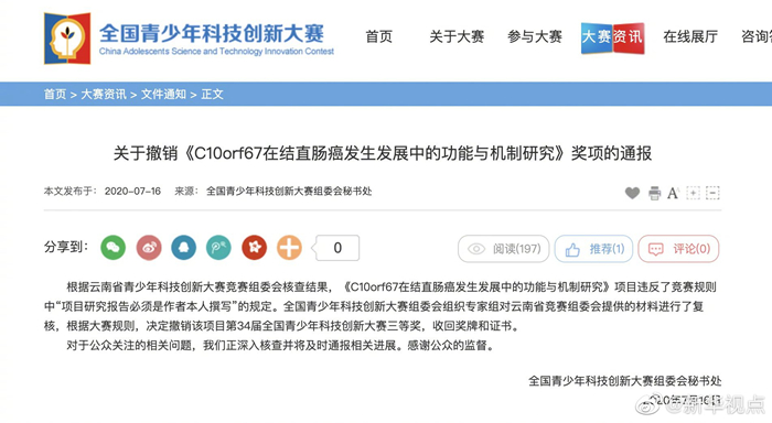 全國青少年科技創(chuàng)新大賽組委會16日發(fā)布通報,根據(jù)云南省青少年科技創(chuàng)新大賽競賽組委會核查結(jié)果,《C10orf67在結(jié)直腸癌發(fā)生發(fā)展中的功能與機制研究》項目違反了競賽規(guī)則中“項目研究報告必須是作者本人撰寫”的規(guī)定。全國青少年科技創(chuàng)新大賽組委會組織專家組對云南省競賽組委會提供的材料進行了復(fù)核,根據(jù)大賽規(guī)則,決定撤銷該項目第34屆全國青少年科技創(chuàng)新大賽三等獎,收回獎牌和證書。對于公眾關(guān)注的相關(guān)問題,正深入核查并將及時通報相關(guān)進展。