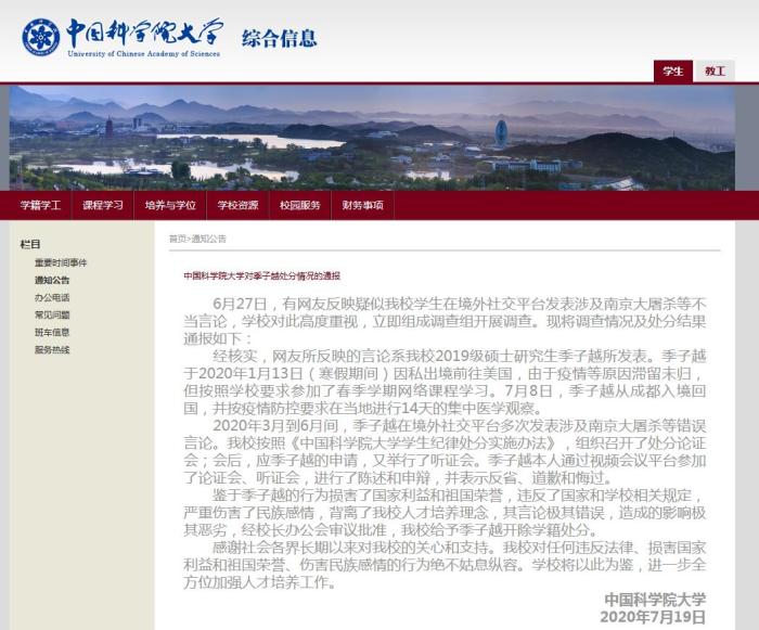 中國(guó)科學(xué)院大學(xué)19日通報(bào)對(duì)季子越處分情況。通報(bào)稱,鑒于2019級(jí)碩士研究生季子越在境外社交平臺(tái)發(fā)表涉及南京大屠殺等不當(dāng)言論,損害了國(guó)家利益和祖國(guó)榮譽(yù),違反了國(guó)家和學(xué)校相關(guān)規(guī)定,嚴(yán)重傷害了民族感情,背離了學(xué)校人才培養(yǎng)理念,其言論極其錯(cuò)誤,造成的影響極其惡劣,經(jīng)校長(zhǎng)辦公會(huì)審議批準(zhǔn),學(xué)校給予季子越開除學(xué)籍處分。
