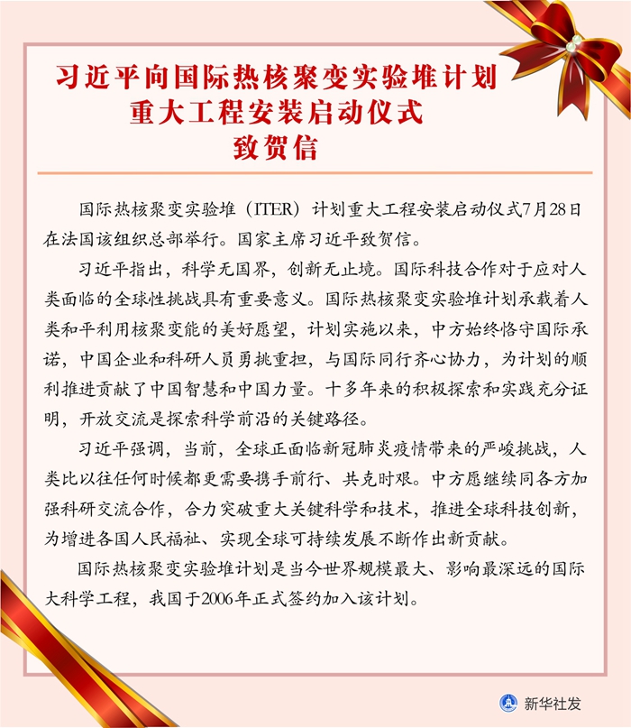 新華社北京7月28日電 國際熱核聚變實(shí)驗(yàn)堆(ITER)計劃重大工程安裝啟動儀式7月28日在法國該組織總部舉行。國家主席習(xí)近平致賀信。