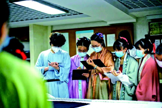 漢服商家、研究者們?cè)谥袊?guó)絲綢博物館仔細(xì)記錄文物細(xì)節(jié)。(陳潤(rùn)熙/攝)