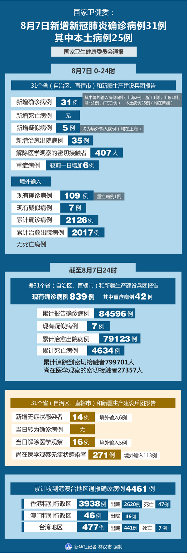 截至8月7日24時,據(jù)31個省(自治區(qū)、直轄市)和新疆生產(chǎn)建設(shè)兵團報告,現(xiàn)有確診病例839例(其中重癥病例42例),累計治愈出院病例79123例,累計死亡病例4634例,累計報告確診病例84596例,現(xiàn)有疑似病例7例。累計追蹤到密切接觸者799701人,尚在醫(yī)學(xué)觀察的密切接觸者27357人。