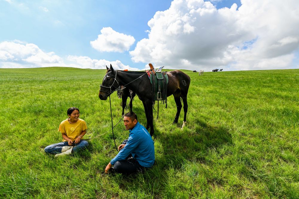 8月4日,錫林花(左)和父親鋼蘇和坐在草地上休息。