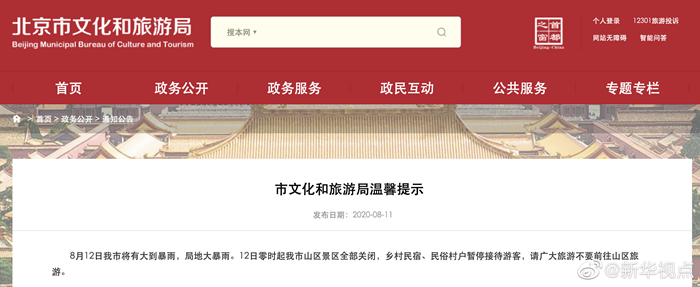 北京市文旅局11日晚間發(fā)布提示稱,8月12日北京將有大到暴雨,局地大暴雨,12日零時起本市山區(qū)景區(qū)全部關閉,鄉(xiāng)村民宿、民俗村戶暫停接待游客,廣大游客不要前往山區(qū)旅游。(記者張漫子) ?????