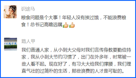 吃飯人人會,但怎么吃卻見境界。早在2013年,總書記在闡述糧食安全戰(zhàn)略時就告誡人們,“要牢記歷史,在吃飯問題上不能得健忘癥,不能好了傷疤忘了疼”。這次,總書記又強(qiáng)調(diào),“盡管我國糧食生產(chǎn)連年豐收,對糧食安全還是始終要有危機(jī)意識”。對此,很多網(wǎng)友深表贊同,認(rèn)為這些指示要言不煩、直指要害,我們決不能忘記餓肚子的歲月!