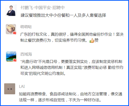 總書記強(qiáng)調(diào),要加強(qiáng)立法,強(qiáng)化監(jiān)管,采取有效措施,建立長效機(jī)制,堅(jiān)決制止餐飲浪費(fèi)行為。網(wǎng)友們就此積極獻(xiàn)計(jì)獻(xiàn)策。