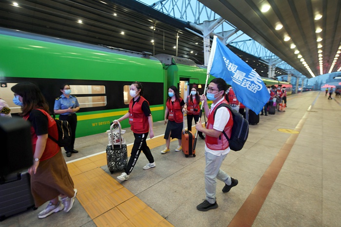 8月16日,參加2020年“發(fā)現(xiàn)最美鐵路”網(wǎng)宣活動(dòng)的媒體記者乘坐列車出發(fā)。(中國(guó)國(guó)家鐵路集團(tuán)有限公司供圖 楊寶森攝)