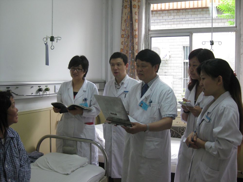 中國醫(yī)學(xué)科學(xué)院腫瘤醫(yī)院徐兵河教授(右三)、馬飛教授(右四)攜治療團隊在病房查問乳腺癌患者康復(fù)情況。圖片由受訪者提供