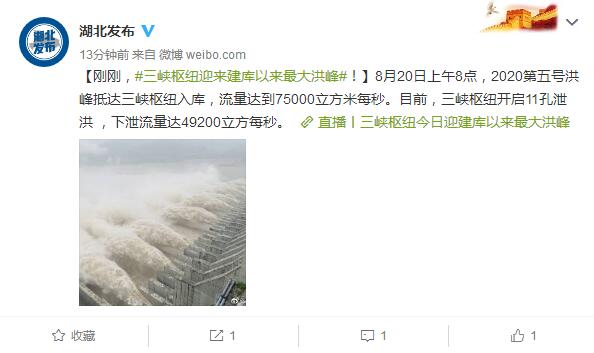 據(jù)湖北省人民政府新聞辦公室官方微博消息,三峽樞紐迎來建庫以來最大洪峰,當(dāng)日上午8點(diǎn),2020第五號洪峰抵達(dá)三峽樞紐入庫,流量達(dá)到75000立方米每秒。