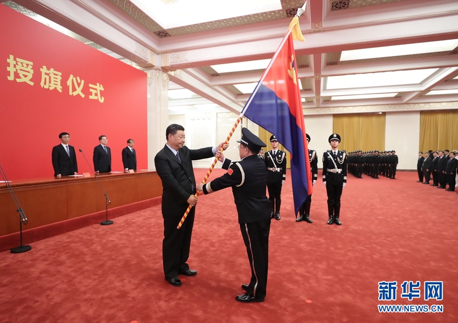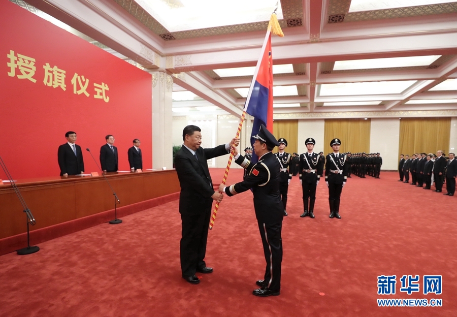 8月26日,中國人民警察警旗授旗儀式在人民大會堂舉行。中共中央總書記、國家主席、中央軍委主席習(xí)近平向中國人民警察隊伍授旗并致訓(xùn)詞。這是習(xí)近平向中國人民警察隊伍授旗。 新華社記者 鞠鵬 攝