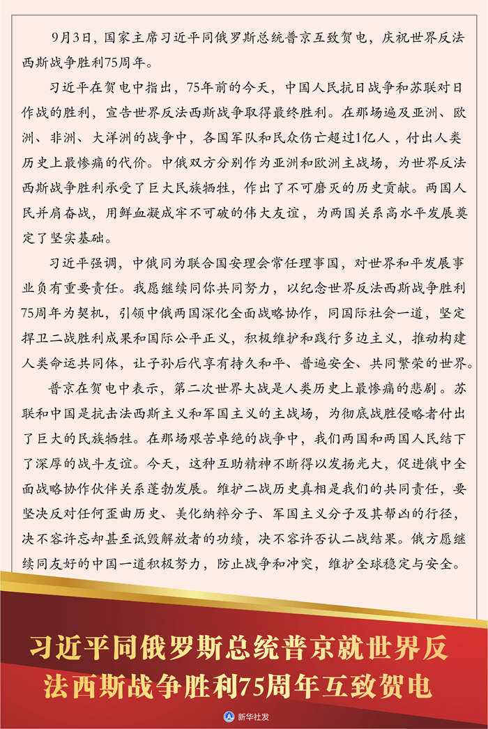 習(xí)近平在賀電中指出,75年前的今天,中國人民抗日戰(zhàn)爭和蘇聯(lián)對日作戰(zhàn)的勝利,宣告世界反法西斯戰(zhàn)爭取得最終勝利。在那場遍及亞洲、歐洲、非洲、大洋洲的戰(zhàn)爭中,各國軍隊(duì)和民眾傷亡超過1億人,付出人類歷史上最慘痛的代價(jià)。中俄雙方分別作為亞洲和歐洲主戰(zhàn)場,為世界反法西斯戰(zhàn)爭勝利承受了巨大民族犧牲,作出了不可磨滅的歷史貢獻(xiàn)。兩國人民并肩奮戰(zhàn),用鮮血凝成牢不可破的偉大友誼,為兩國關(guān)系高水平發(fā)展奠定了堅(jiān)實(shí)基礎(chǔ)。