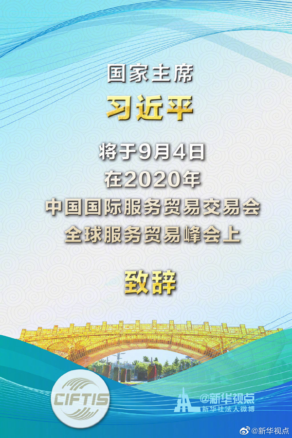外交部發(fā)言人華春瑩9月3日宣布:2020年中國(guó)國(guó)際服務(wù)貿(mào)易交易會(huì)全球服務(wù)貿(mào)易峰會(huì)將于9月4日在北京舉行。國(guó)家主席習(xí)近平將在峰會(huì)上致辭。?
