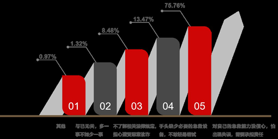 廉思課題組的報(bào)告顯示,缺乏急救知識(shí)是大學(xué)生不愿參與現(xiàn)場急救的原因之一。當(dāng)遇到呼吸停止的無意識(shí)人員時(shí),68.33%的被調(diào)查者選擇“撥打120,并在原地等候”,能“立即上前查看,并采取急救措施”的只有25.76%。