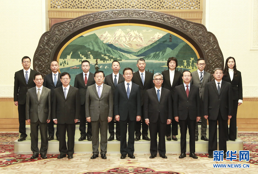 9月16日,中共中央政治局常委、國(guó)務(wù)院副總理、中央港澳工作領(lǐng)導(dǎo)小組組長(zhǎng)韓正在北京人民大會(huì)堂會(huì)見(jiàn)澳門(mén)特別行政區(qū)保安司司長(zhǎng)黃少澤率領(lǐng)的澳門(mén)紀(jì)律部隊(duì)高層代表團(tuán),與他們交流并合影留念。 新華社記者 龐興雷 攝