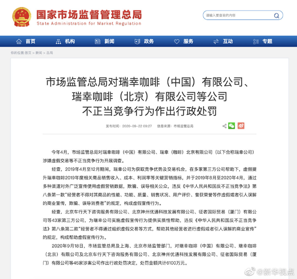 2020年9月18日,市場監(jiān)管總局及上海、北京市場監(jiān)管部門,對瑞幸咖啡(中國)有限公司、瑞幸咖啡(北京)有限公司及北京車行天下咨詢服務(wù)有限公司、北京神州優(yōu)通科技發(fā)展有限公司、征者國際貿(mào)易(廈門)有限公司等45家涉案公司作出行政處罰決定,處罰金額共計(jì)6100萬元。