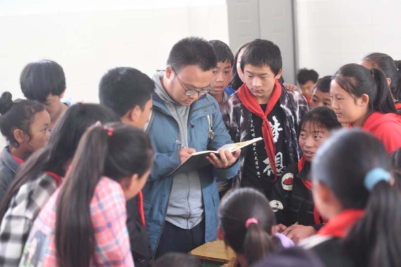 四川日報侯沖在美姑縣典補(bǔ)鄉(xiāng)中心小學(xué)采訪當(dāng)?shù)乜剌z保學(xué)