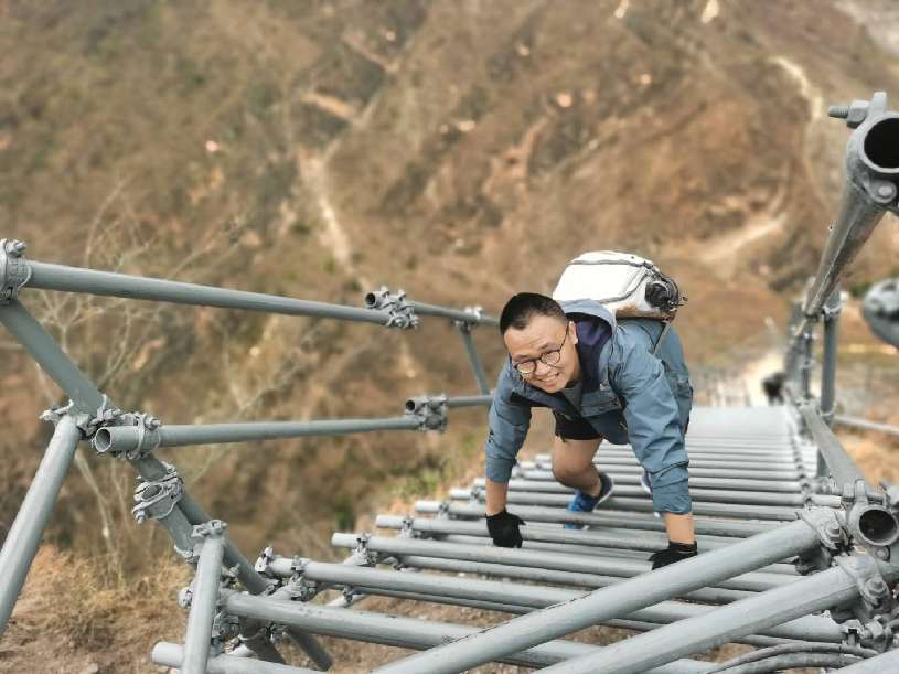 四川日報記者侯沖攀爬鋼梯進(jìn)入“懸崖村”采訪途中