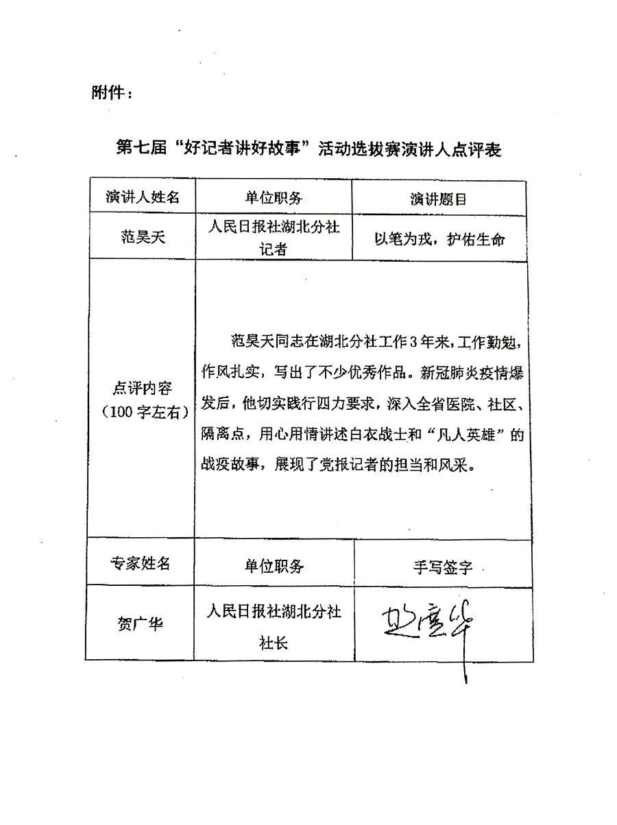 武漢爆發(fā)疫情以來,湖北分社“90后”記者范昊天同志就一直奮戰(zhàn)在疫情防控一線,深入全省醫(yī)院、社區(qū)、隔離點(diǎn)采訪,參與推出《武漢 分秒必爭抗疫情》《武漢保衛(wèi)戰(zhàn)打響關(guān)鍵之役》《八古墩社區(qū)的這場保衛(wèi)戰(zhàn)》《黃岡戰(zhàn)“疫”,防控更嚴(yán)更實更細(xì)》等數(shù)十篇實地探訪的獨(dú)家深度報道,還采寫呼吁各級干部下沉社區(qū)等多篇內(nèi)參,推動解決基層防控難題。疫情期間,他和同事們不斷上報“四類人員”信息,幫助大量患者得到妥善收治。2020年9月,隨分社榮獲“全國抗擊新冠肺炎疫情先進(jìn)集體”,本人獲得人民日報社抗疫先進(jìn)個人、武漢市抗疫先進(jìn)個人等榮譽(yù)。
