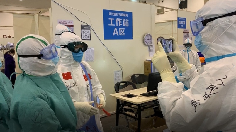 3月7日,武漢首批最大規(guī)模方艙醫(yī)院東西湖方艙醫(yī)院休艙現(xiàn)場,人民日報記者吳姍(右)見證最后一批轉(zhuǎn)院患者出艙。