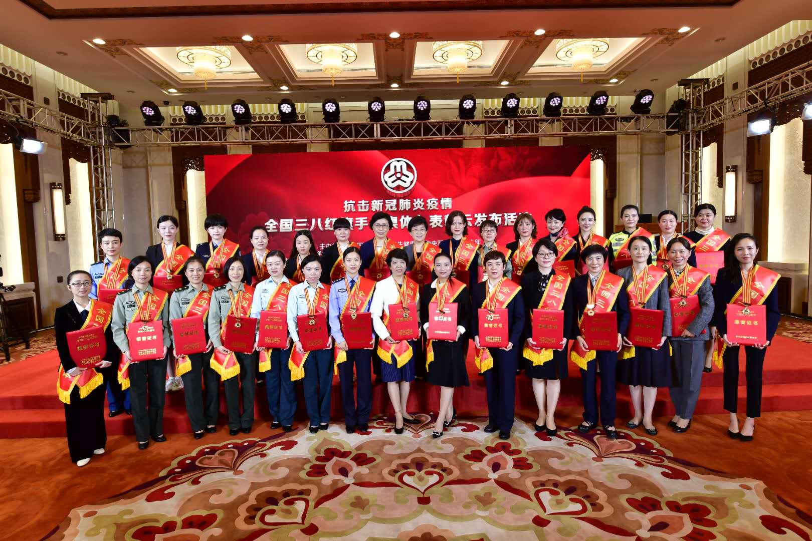 受表彰的抗擊新冠肺炎疫情全國(guó)三八紅旗手(集體)合影。