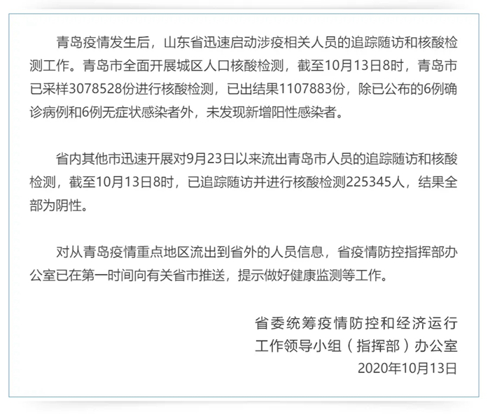山東省迅速開展青島疫情相關(guān)人員追蹤隨訪和核酸檢測工作