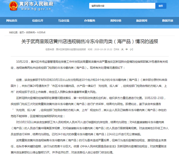 10月22日,黃州區(qū)市場監(jiān)督管理局在排查工作中發(fā)現武商量販店黃州店嚴重違反區(qū)新冠肺炎疫情防控指揮部第24號通告有關規(guī)定,違規(guī)銷售兩批未經疾控部門檢測的冷凍冷藏肉類(海產品)?,F將有關處理情況通報如下: