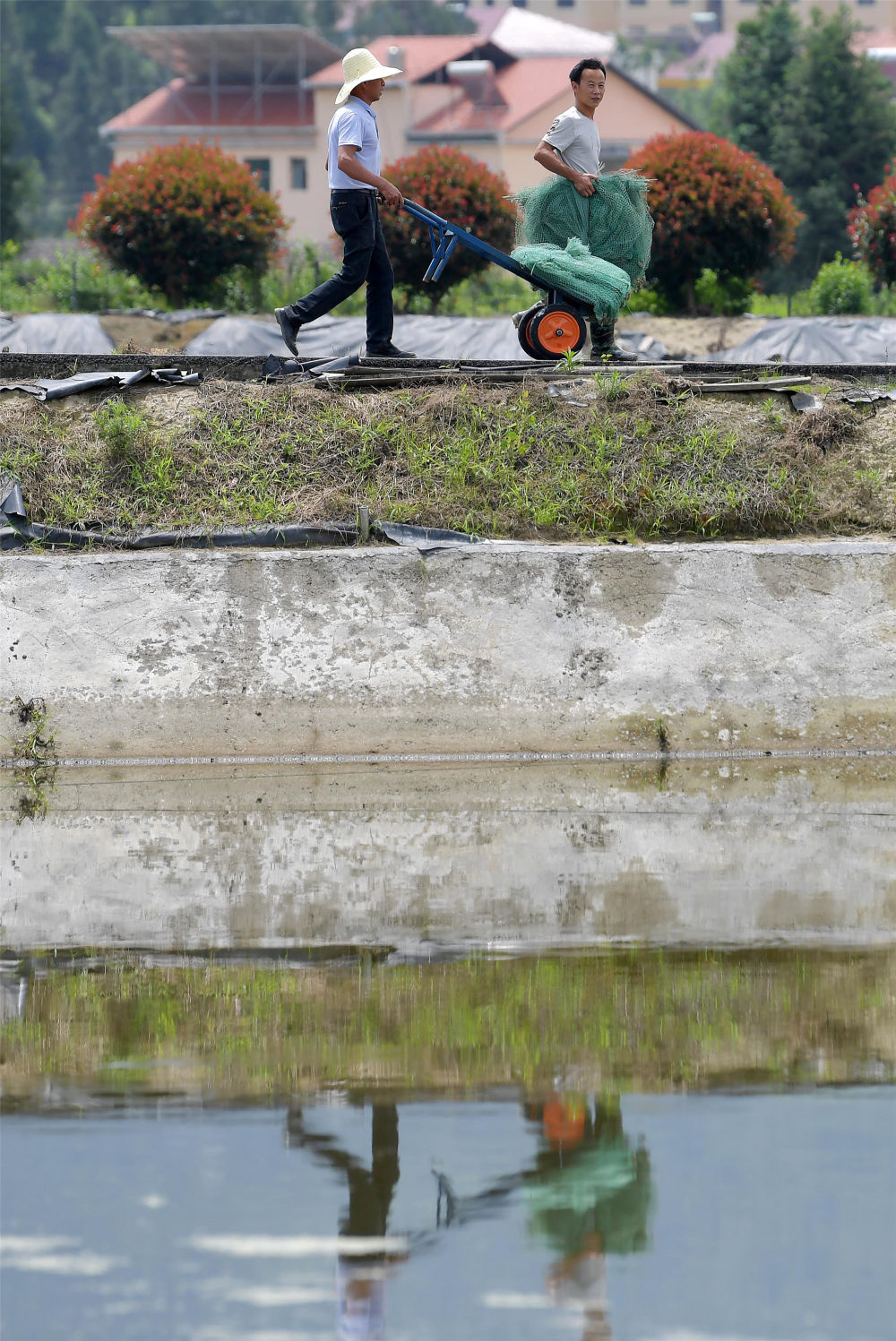 在江西省修水縣黃沙鎮(zhèn)湯橋村,返鄉(xiāng)創(chuàng)業(yè)大學(xué)生李平(右)和水產(chǎn)合作社的工作人員準(zhǔn)備去放對(duì)蝦蝦苗。他創(chuàng)辦的水產(chǎn)合作社幫助周邊村民就業(yè)(5月20日攝)。新華社記者 彭昭之 攝