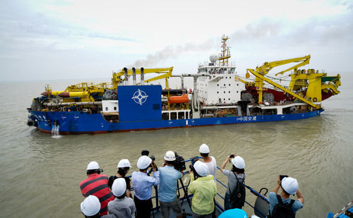 在江蘇啟東,“天鯤號”自航絞吸挖泥船駛離碼頭出港海試(2018年6月8日攝)。新華社記者 李響 攝