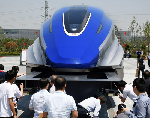 在山東青島,人們在時速600公里高速磁浮試驗樣車下線儀式上參觀(2019年5月23日攝)。新華社記者 李紫恒 攝