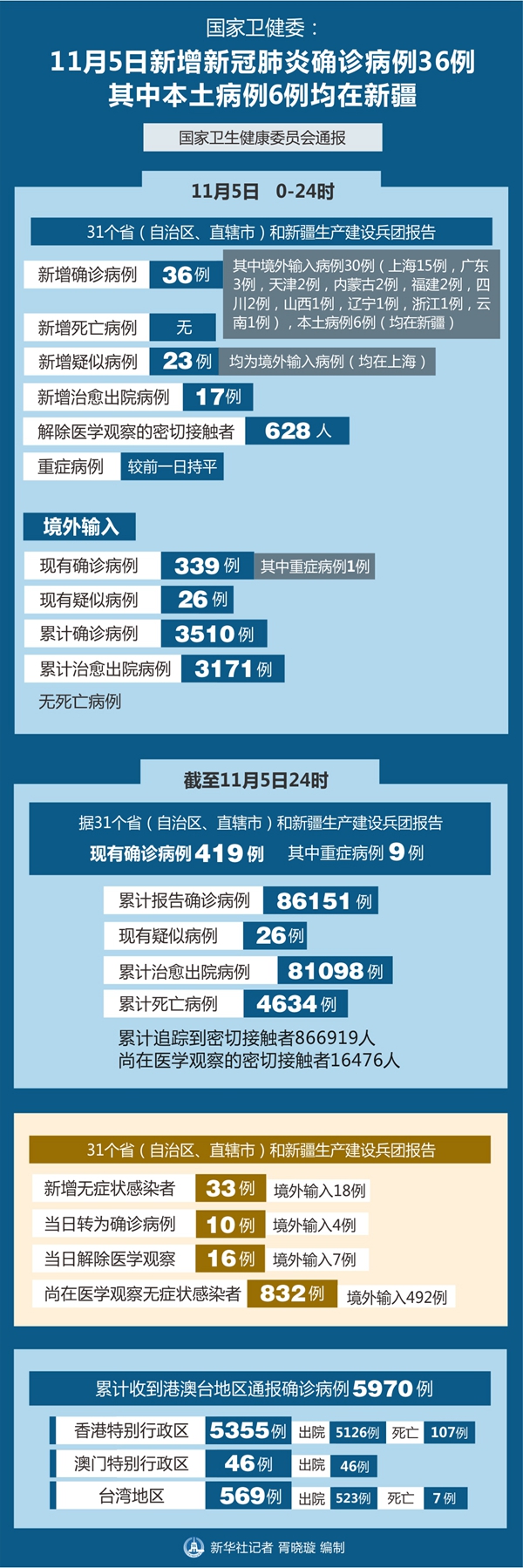 新華社北京11月6日電? 國家衛(wèi)生健康委員會6日通報,11月5日0-24時,31個?。ㄗ灾螀^(qū)、直轄市)和新疆生產建設兵團報告新增新冠肺炎確診病例36例,其中境外輸入病例30例(上海15例,廣東3例,天津2例,內蒙古2例,福建2例,四川2例,山西1例,遼寧1例,浙江1例,云南1例),本土病例6例(均在新疆);無新增死亡病例;新增疑似病例23例,均為境外輸入病例(均在上海)。