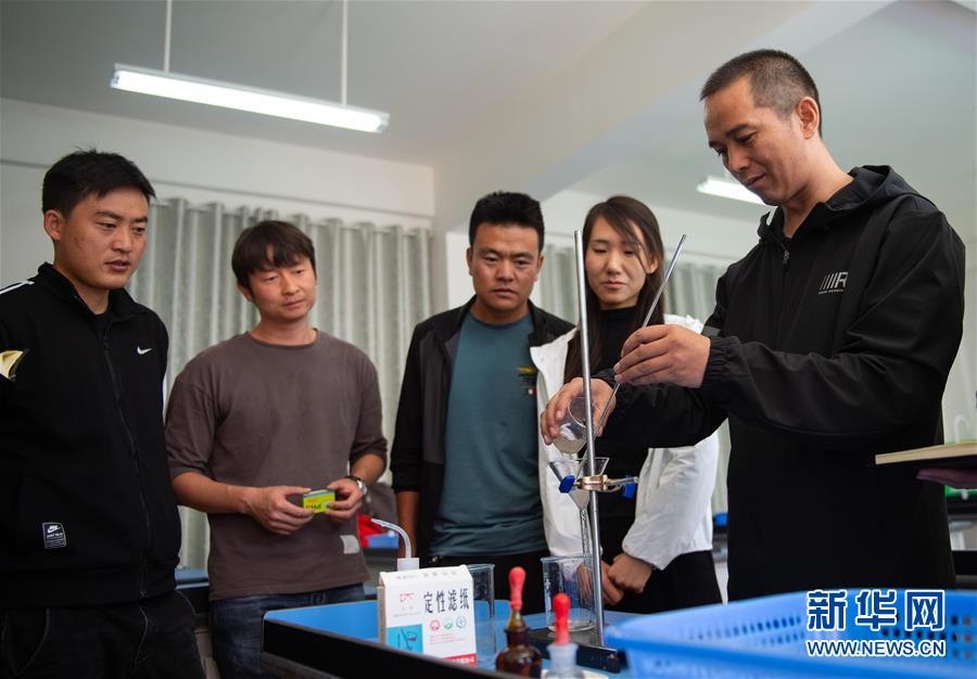 北京市援青支教教師、來自通州區(qū)陸辛莊學(xué)校的化學(xué)教師祁生貴(右一)在青海省玉樹州第四民族高級中學(xué)指導(dǎo)學(xué)校教師進行實驗教學(xué)(8月12日攝)。新華社記者 陳鐘昊 攝