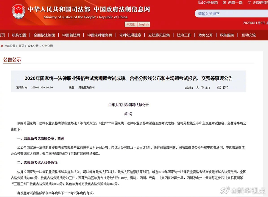 記者9日從司法部獲悉,2020年國(guó)家統(tǒng)一法律職業(yè)資格考試客觀題考試成績(jī)將于11月10日公布,全國(guó)合格分?jǐn)?shù)線為180分。自11月10日0時(shí)起,應(yīng)試人員可通過司法部網(wǎng)站、司法部微信公眾號(hào)和中國(guó)普法網(wǎng)、中國(guó)普法微信公眾號(hào)查詢成績(jī),登錄司法部網(wǎng)站自行下載打印成績(jī)通知單。通過2020年客觀題考試的應(yīng)試人員和2019年客觀題考試保留有效成績(jī)?nèi)藛T,應(yīng)于11月10日0時(shí)至11月14日24時(shí),登錄司法部網(wǎng)站報(bào)名確認(rèn)參加主觀題考試。(記者白陽)