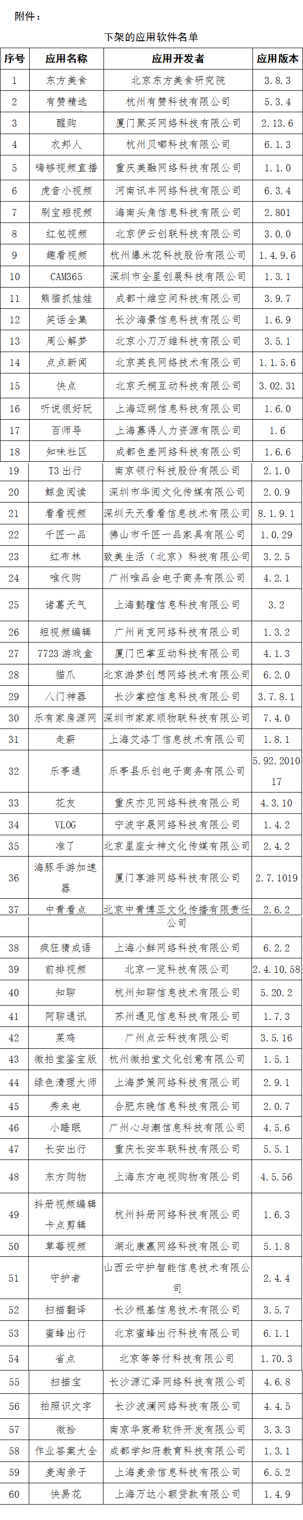新華社北京11月10日電(記者張辛欣)工信部10日通報,截至目前,經第三方檢測機構核查復檢,有贊精選、紅布林等60款App存在侵害用戶權益行為且未按照要求完成整改。依據有關法律和規(guī)范性文件要求,工信部組織對上述App進行下架。