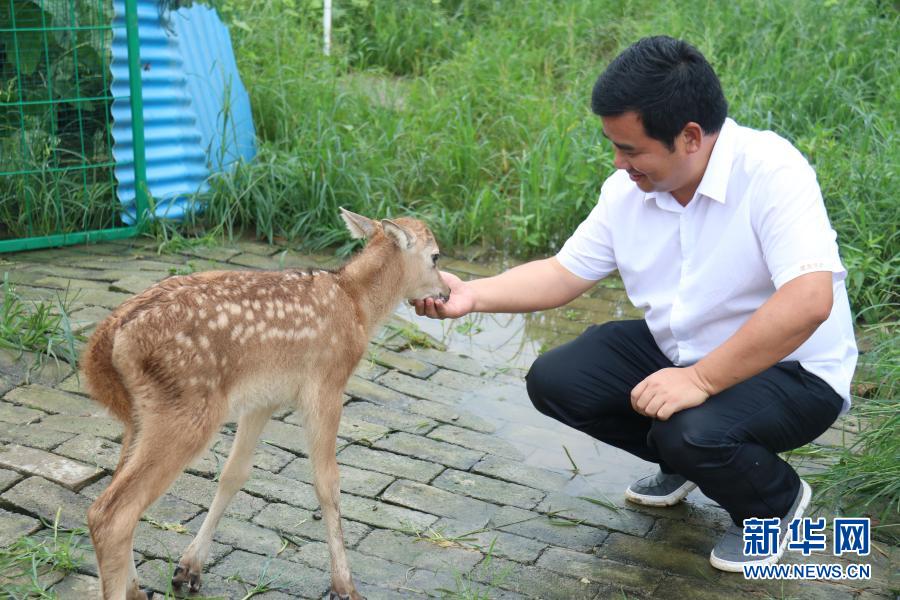 東洞庭湖麋鹿保護(hù)協(xié)會(huì)會(huì)長(zhǎng)李政與小麋鹿“果果”互動(dòng)(7月8日攝)。新華社記者 蔡瀟瀟 攝