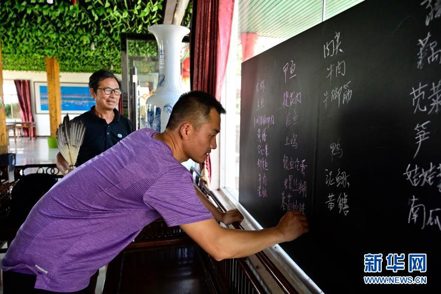 在江西省余干縣田園鄱陽(yáng)湖景區(qū),上岸漁民朱義才(后)在自己開辦的農(nóng)家樂(lè)內(nèi)和兒子一起寫當(dāng)日的菜譜(6月16日攝)。新華社記者 彭昭之 攝