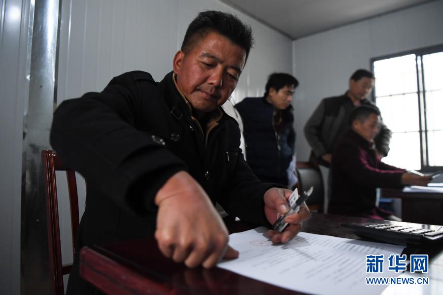 在湖南常德漢壽縣蔣家嘴鎮(zhèn),一名過(guò)去在洞庭湖捕魚的漁民在漢壽縣捕撈漁民退捕協(xié)議書上按下手?。?019年12月17日攝)。新華社記者 薛宇舸 攝
