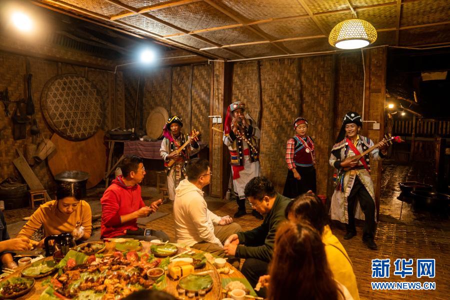 在怒江州福貢縣匹河怒族鄉(xiāng)老姆登村,怒族群眾郁五林(后排右三)在自家開(kāi)的農(nóng)家樂(lè)給客人表演民族歌舞(11月2日攝)。新華社記者 胡超 攝