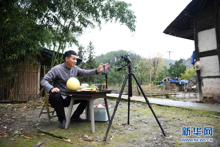 梁平七星鎮(zhèn)小伙曾慶貴通過(guò)網(wǎng)絡(luò)直播推銷家鄉(xiāng)特色農(nóng)產(chǎn)品(11月18日攝)。新華社記者 唐奕 攝