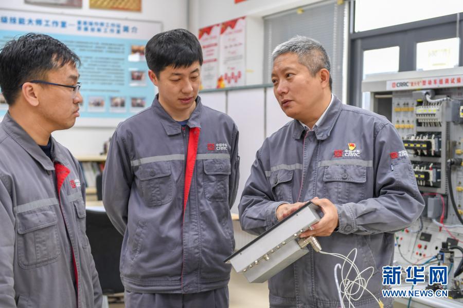 11月25日,在中車長春軌道客車股份有限公司高速動(dòng)車組制造中心調(diào)試車間,羅昭強(qiáng)(右一)與同事研究高鐵列車網(wǎng)絡(luò)實(shí)驗(yàn)裝置。新華社記者 張楠 攝