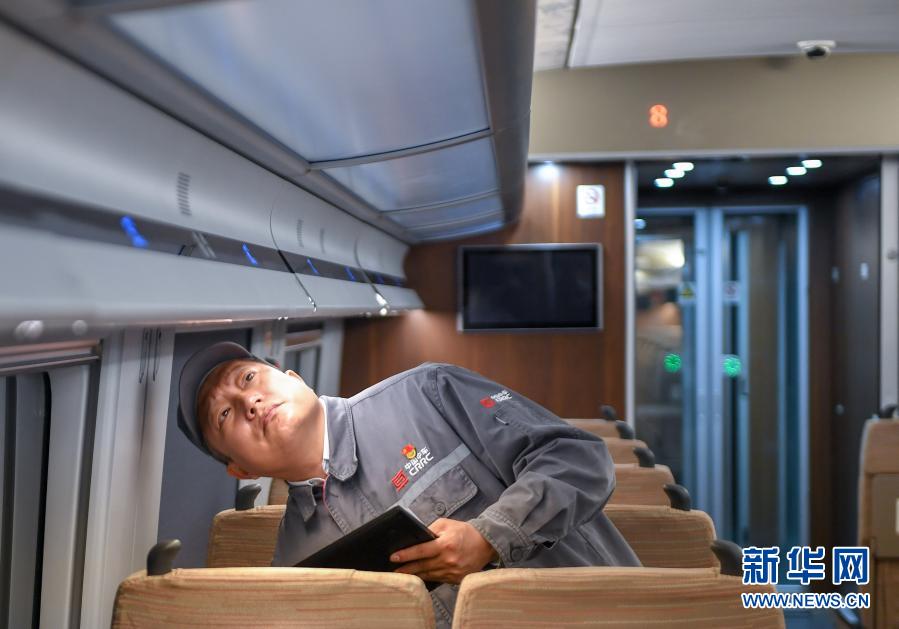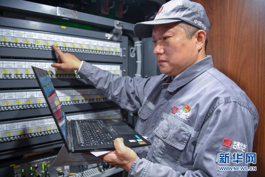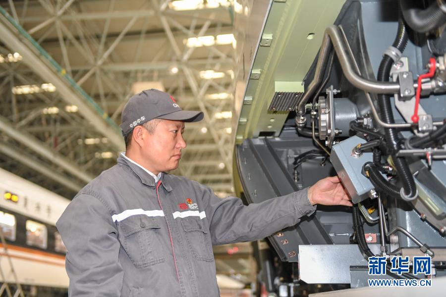 11月25日,在中車長春軌道客車股份有限公司高速動(dòng)車組制造中心調(diào)試車間,羅昭強(qiáng)檢查復(fù)興號高鐵列車裝置的工作情況。新華社記者 張楠 攝