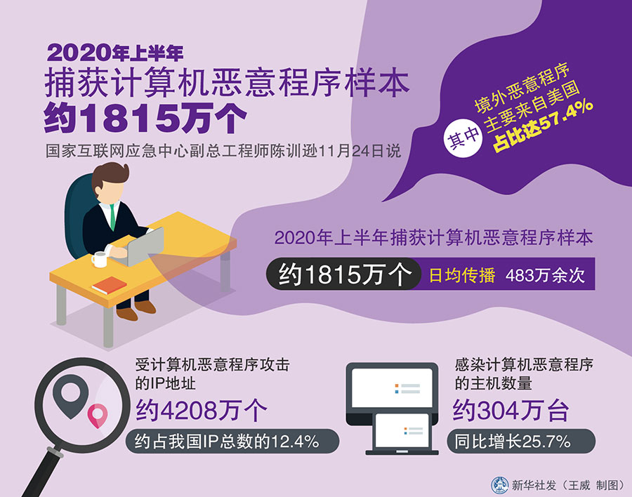新華社杭州11月25日電(記者溫競?cè)A、朱涵)國家互聯(lián)網(wǎng)應(yīng)急中心副總工程師陳訓遜24日說,國家互聯(lián)網(wǎng)應(yīng)急中心對我國網(wǎng)絡(luò)安全態(tài)勢監(jiān)測數(shù)據(jù)顯示,2020年上半年捕獲計算機惡意程序樣本約1815萬個,日均傳播次數(shù)483萬余次。其中境外惡意程序主要來自美國,占比達57.4%。